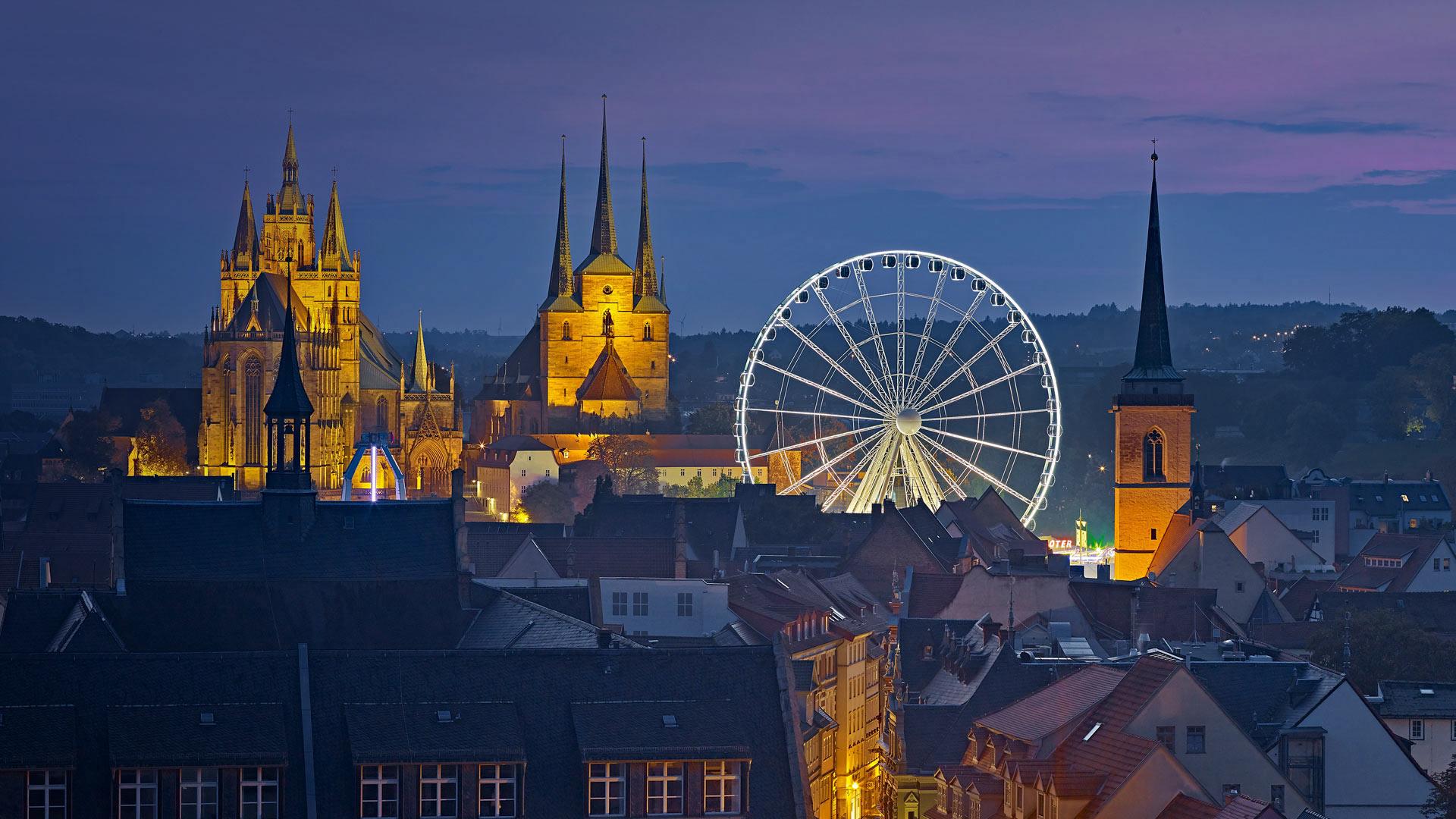 慕尼黑啤酒节期间的摩天轮以及埃尔福特大教堂和圣西弗勒斯教堂的景象
