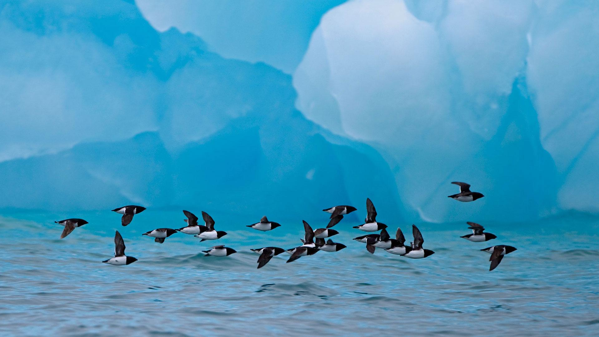 小海雀们飞过冰山,挪威斯匹次卑尔根群岛