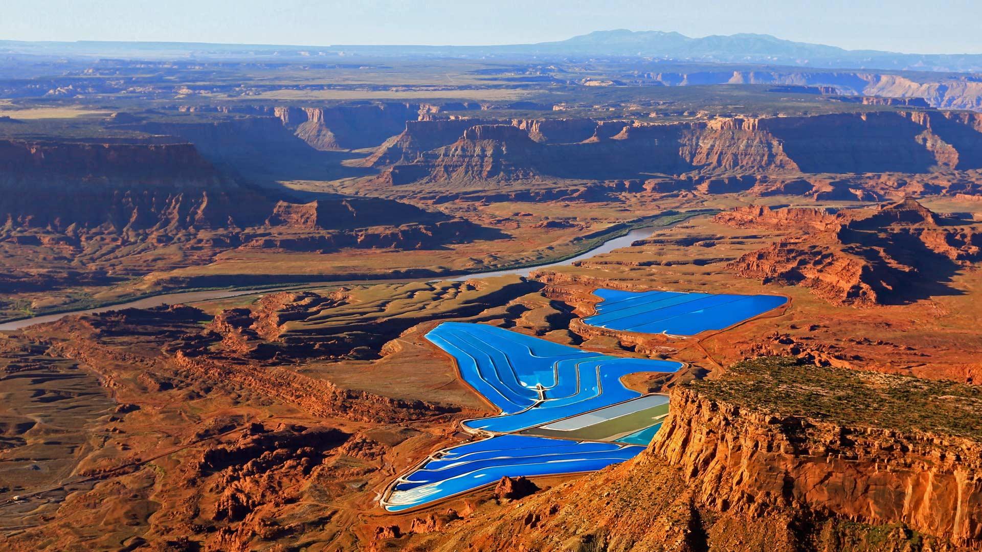 钾蒸发池是位于犹他州摩押附近的沙漠中的一道风景。这些水被染成蓝色,这样有助于加速蒸发,而且可能对远距离观察工作场地非常有用。钾碱是什么?这是一组以钾为基础的化合物,已经被人类开采了几个世纪。由于钾碱是水溶性的,所以蒸发池是提取土壤中有用的化学物质的理想方法。