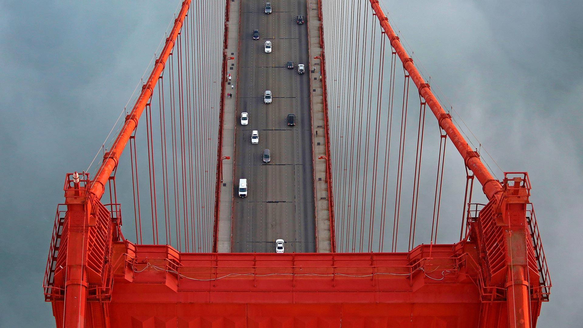 对于那些在上世纪30年代帮助建造这座地标的勇士们来说,这幅金门大桥的鸟瞰图是非常熟悉的。桥梁的建设仅历时4年,那个时候如果遇到强风就会造成危险的情况。为了保护工人,他们安装了一个安全网,而有19人因安全网而获救,之后这19人成为了“去地狱的半路俱乐部”的荣誉会员。