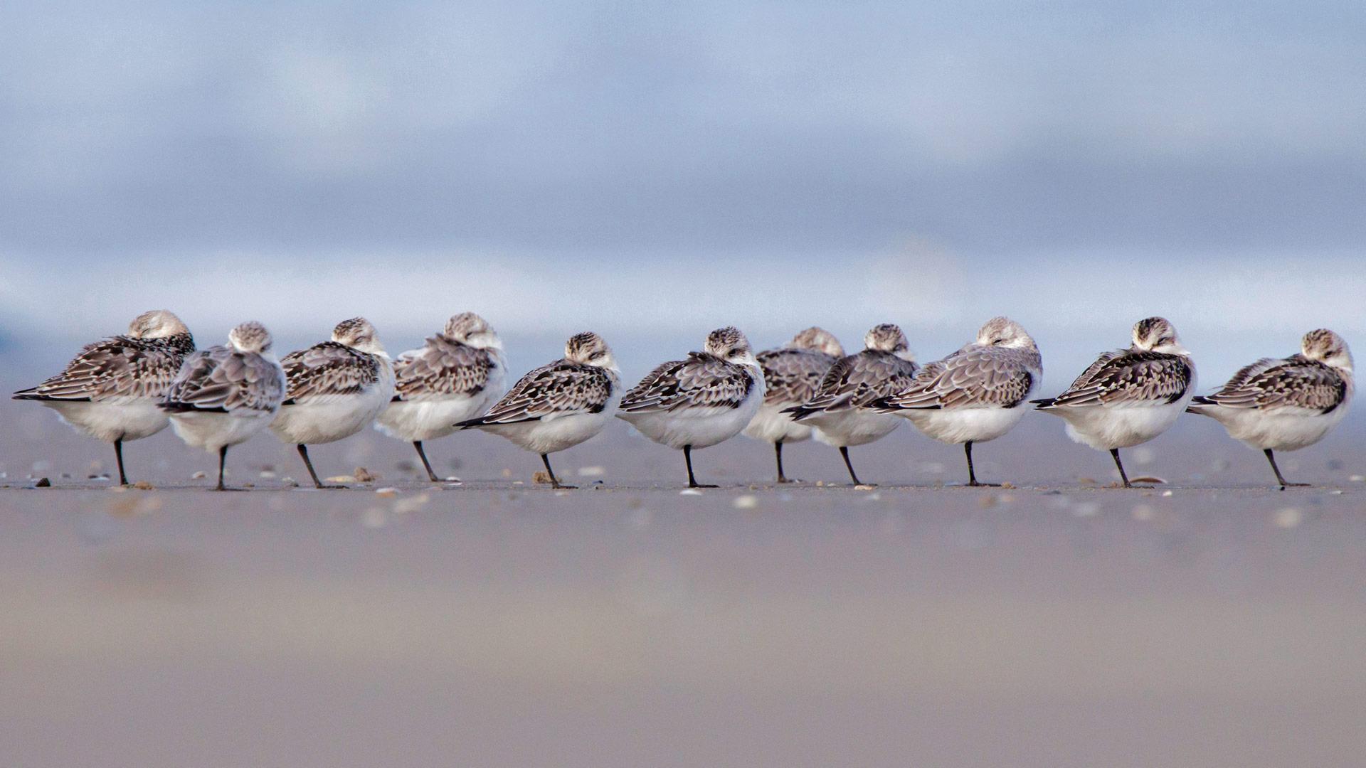 这群熟睡中的三趾鹬生活在荷兰的泰尔斯海灵岛上,别看它们个头小,但却是每年迁徙极长距离的活跃鸟类。春天来临时,它们从南美洲和非洲飞到高北极的海滩和北美、欧洲和亚洲的河岸。一旦它们产下卵并需要抚养幼崽,它们就又回到了南方。它们会在沿途的海滩上停下来,在那里它们可以更轻易的找到食物。