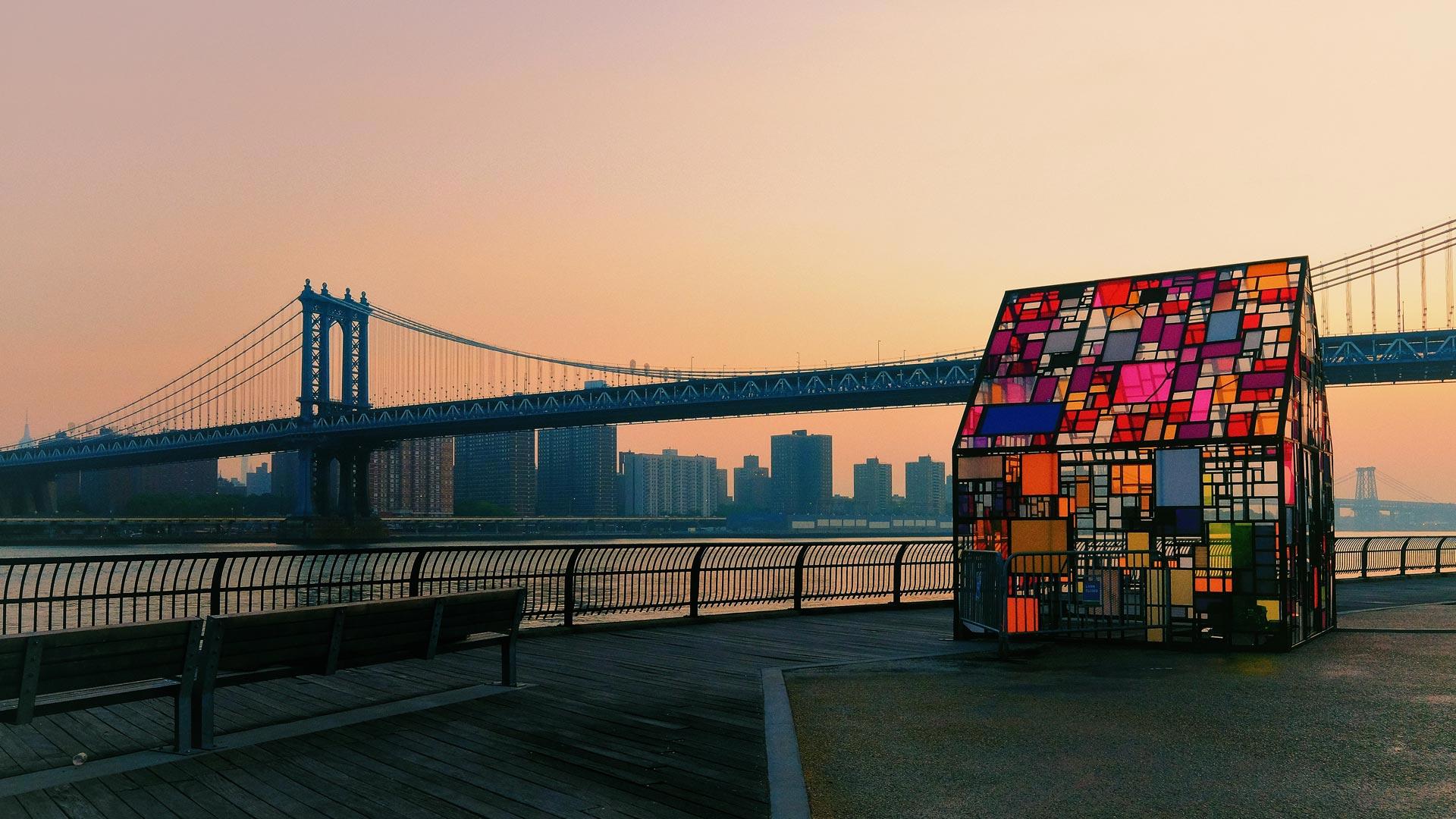 ‘Kolonihavehus, 2010’是布鲁克林大桥公园的一幅公共艺术作品,位于东河的布鲁克林一侧。这幅作品由艺术家汤姆·弗鲁因利用在当地打捞的废弃有机玻璃制成,灵感来自于哥本哈根。布鲁克林大桥公园占地85英亩,设计师将这里由工业厂区转变为休闲天堂,站在码头上,你可以看见生机勃勃的船运与曼哈顿的天际线。