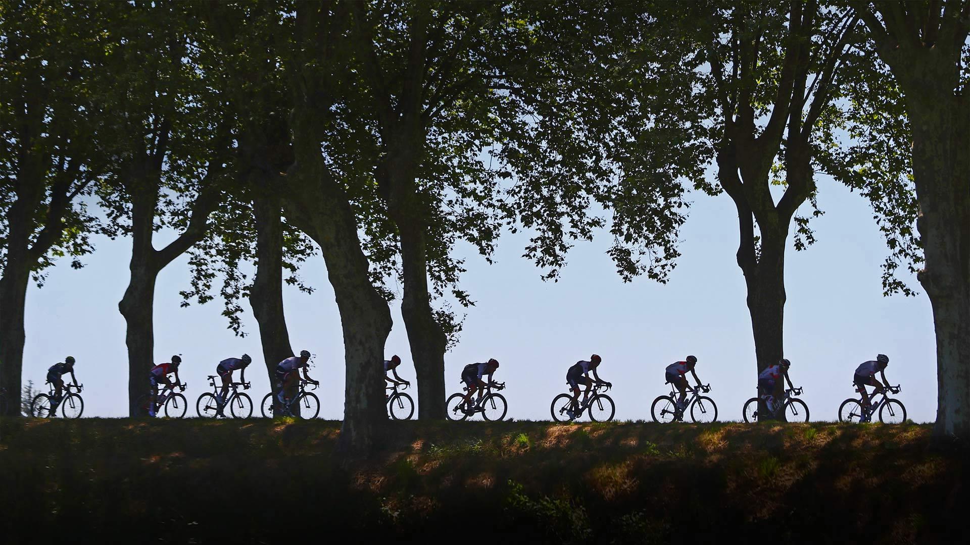 2016年环法自行车赛中骑在绿树成荫的道路上的选手