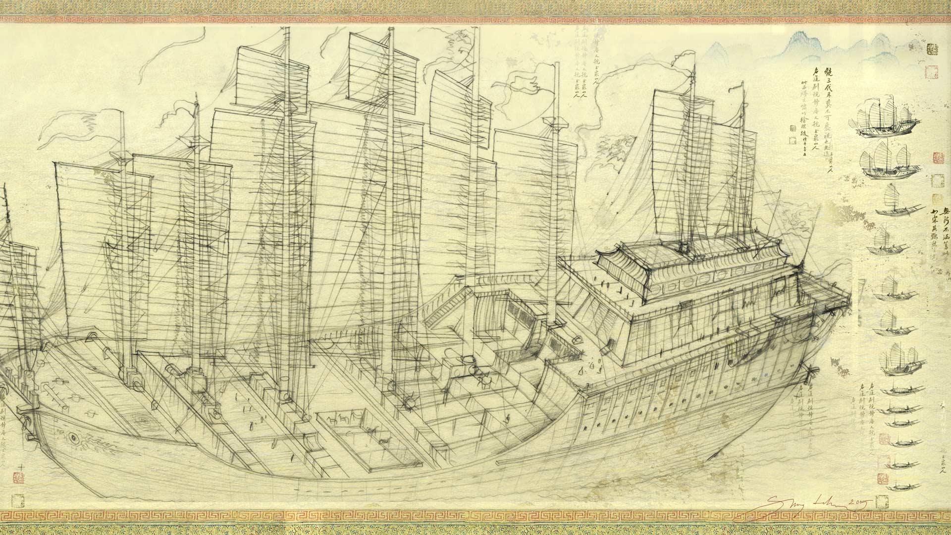 2005年7月11日,是中国伟大航海家郑和下西洋600周年纪念日。2005年4月25日,经国务院批准,将每年的7月11日确立为“中国航海节”,作为国家的重要节日固定下来。壁纸所展示的是当时郑和下西洋时用的船只的结构设计图,这艘船帮助郑和抵御了巨大的风暴,也见证了六百多年前的世界!