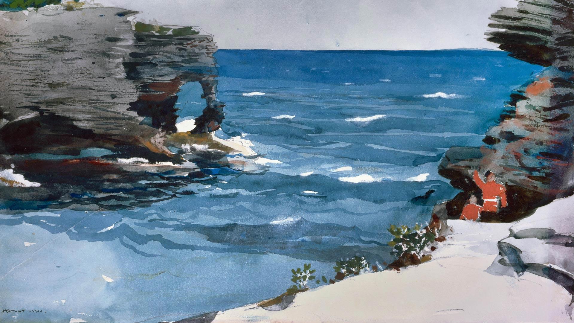 波士顿美术馆收藏的画家温斯洛·霍默的水彩画'Rocky Shore'