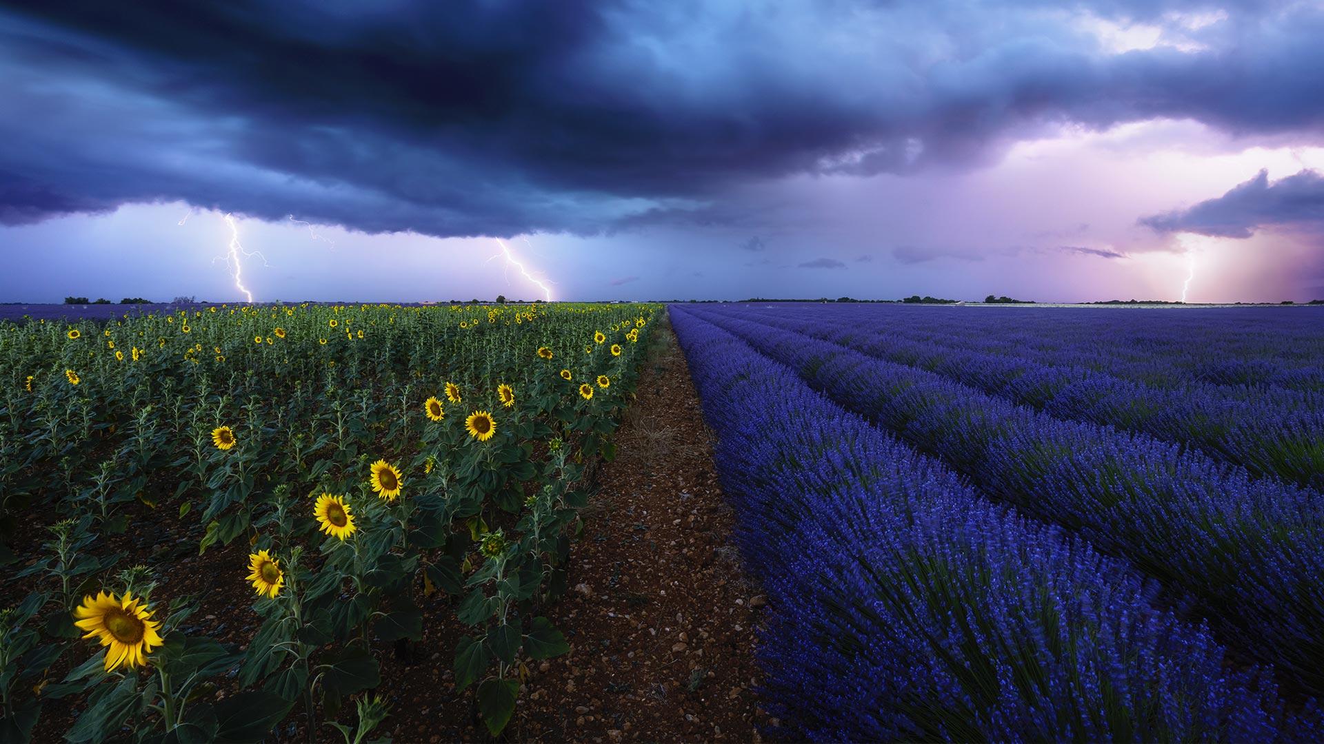 暴风雨下的薰衣草和向日葵花田,法国普罗旺斯 © beboy/Shutterstock 思念的花海 反复无常的天气是否让你更深刻的感受到秋天的来临,前一秒晴空万里下一秒电闪雷鸣的景象也成为家常便饭,就像这壁纸中暴风雨下的薰衣草和向日葵花田,远处的闪电让花田有着更加生动鲜明的对比,那片花海是否也是你心中的花田呢?来吧,让我们一起去普罗旺斯寻找心中的那片花海! 法国 壁纸 秋天 景象 向日葵 普罗旺斯 衣草 暴风雨 花海 来临 闪电 是否 生动 一秒 花田