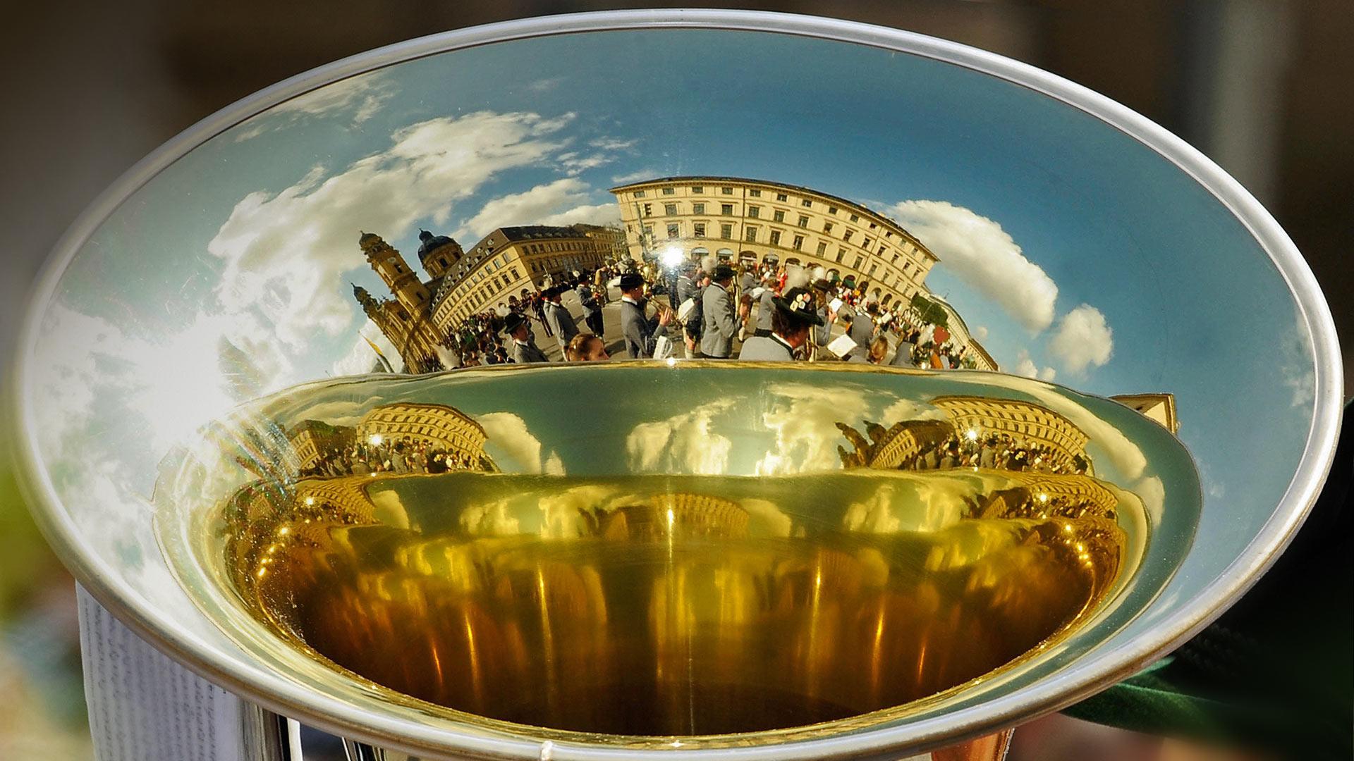 今天这张特殊的壁纸其实是慕尼黑啤酒节期间游行的人群倒映在了法国号的喇叭上。在德国慕尼黑,为期16天的啤酒节将会有许多铜管乐队的游行,他们用法国号演奏经典的巴伐利亚民间音乐。作为慕尼黑一年中最盛大的活动,在这里你不仅能品尝到世界各地好喝的啤酒,更有狂欢游行和音乐节,简直是派对控和酒鬼们的盛宴!