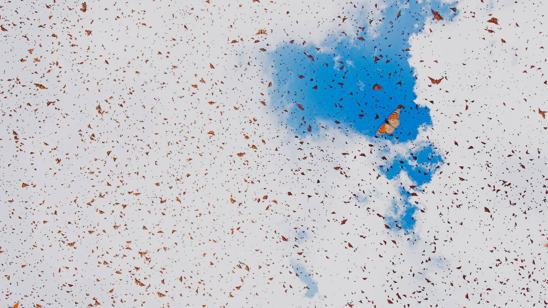 秋天,黑脉金斑蝶开始了长达3000英里的迁徙旅程,它们从加拿大南部迁移到墨西哥中部的越冬栖息地。在那里,它们在冷杉树中聚集在一起,并形成一种橙色,飘动的树叶的错觉。到了第二年三月,它们将离开越冬栖息地,旅程再次开始。 但没有一只黑脉金斑蝶能够完成整个往返旅程,因为这超过了它们的寿命;因此,它们迁徙一次往往需要很多代才能完成。