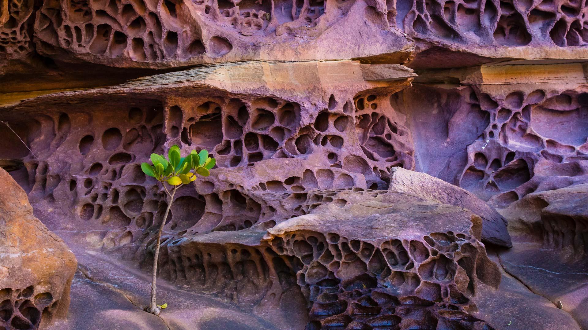 远看像蜂窝,近看像蜂窝,用手摸一摸,却不是蜂窝!没错,壁纸中这些布满大大小小坑洞的玩意儿确实不是蜜蜂的家,而是澳大利亚西北部的库拉马湾的岩石因蜂窝状风化作用而形成的,也叫蜂窝岩,它们结构优美,长的像蜂巢蛋糕一样,如果能吃的话绝对酥脆爽口!