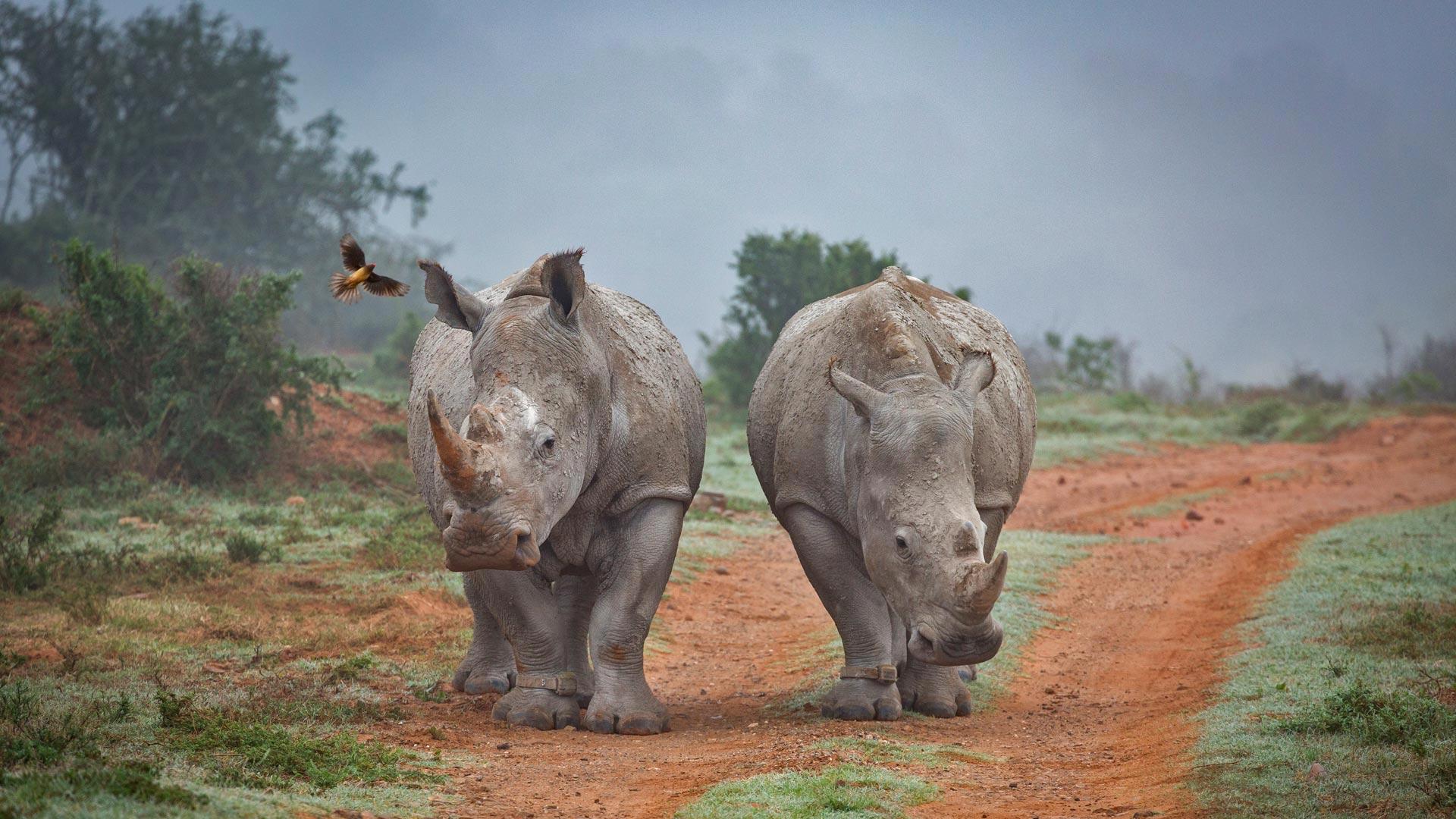 阿姆哈拉禁猎区的两只犀牛和一只啄牛鸟,南非 (© Robert Harding World Imagery/Offset)
