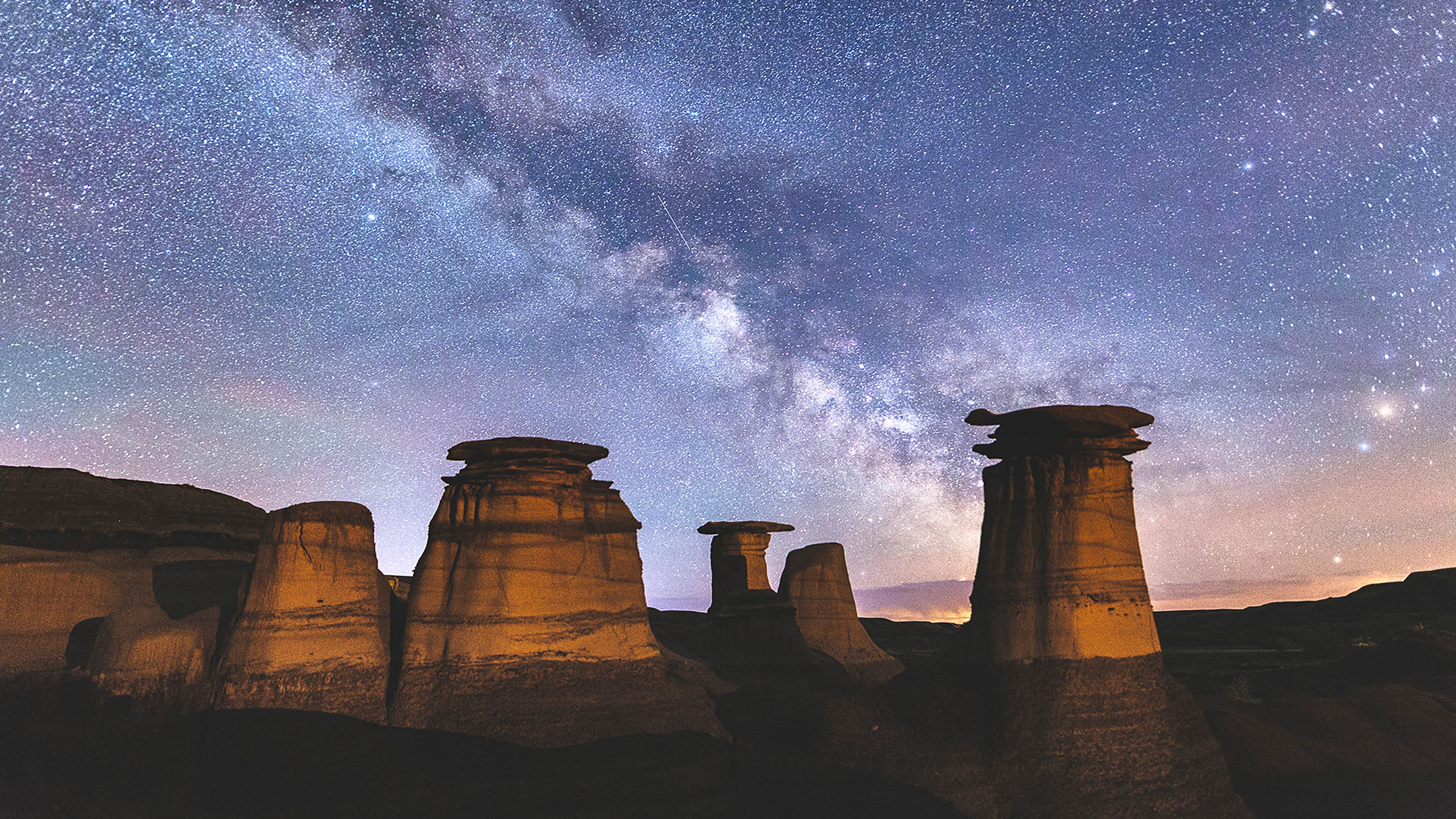 加拿大恶地里石窟上方的银河,加拿大亚伯达省德拉姆黑勒 (© Felis Images/Minden Pictures)