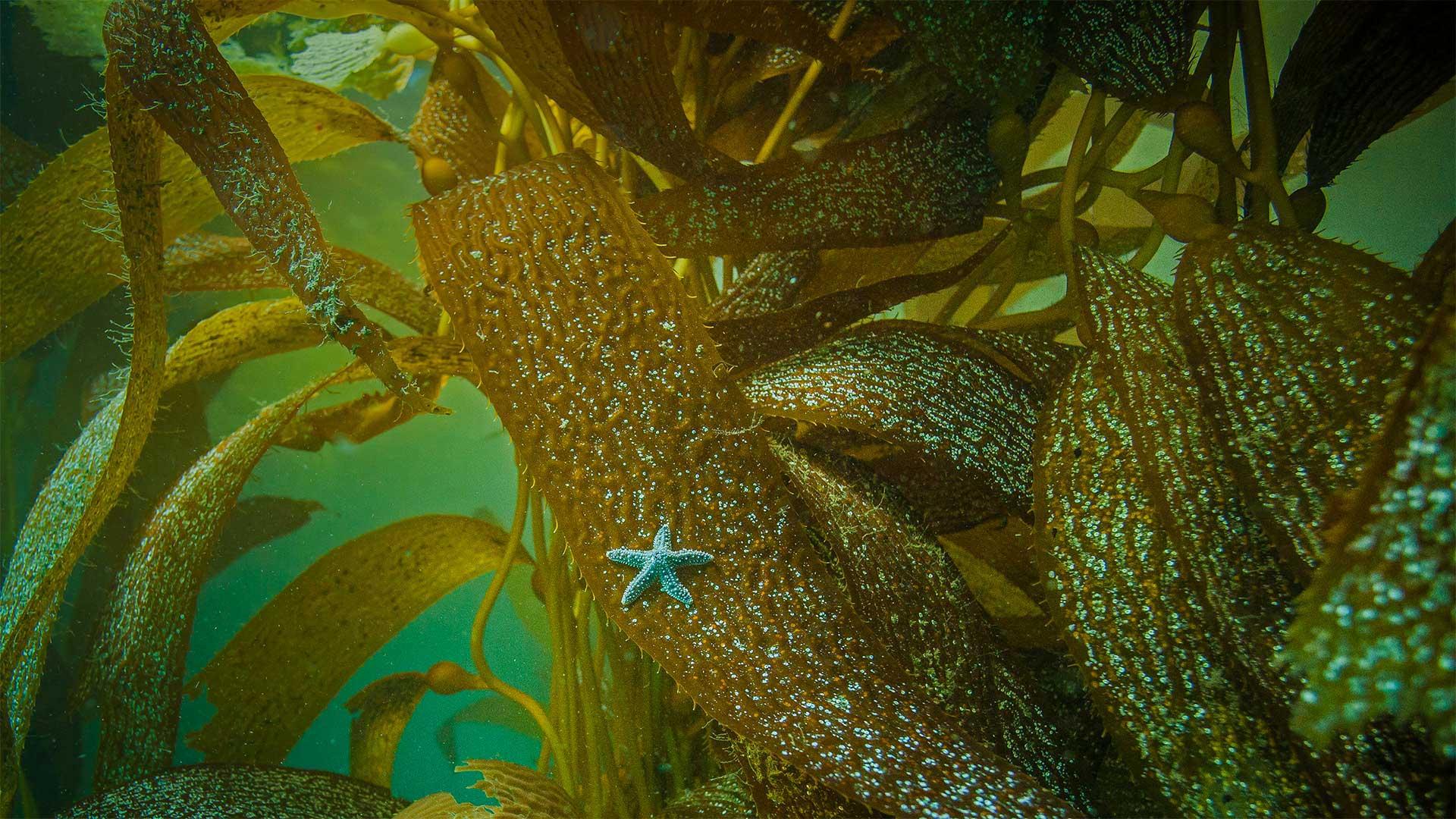 在加州海岸海藻上的赭色海星 (© Ralph Pace/Minden Pictures)