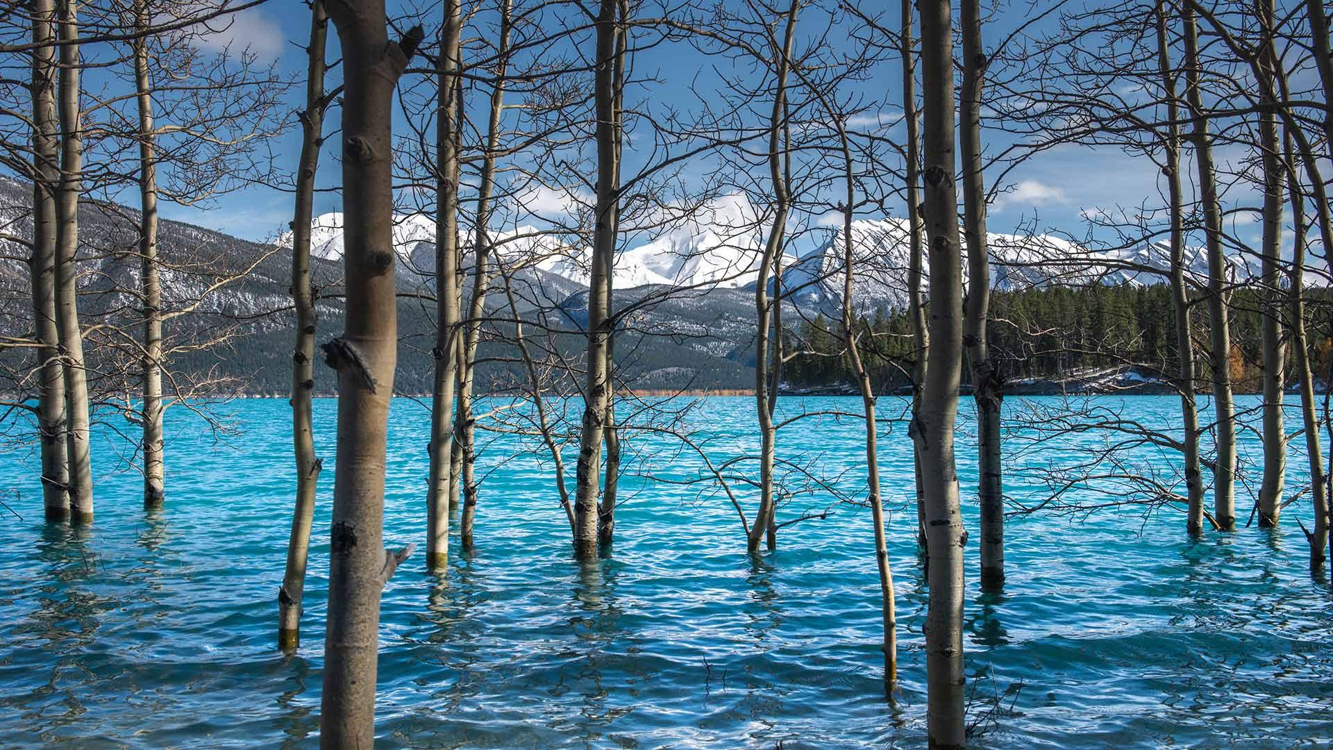 亚伯拉罕湖中的树,加拿大艾伯塔 (© Coolbiere/Getty Images)