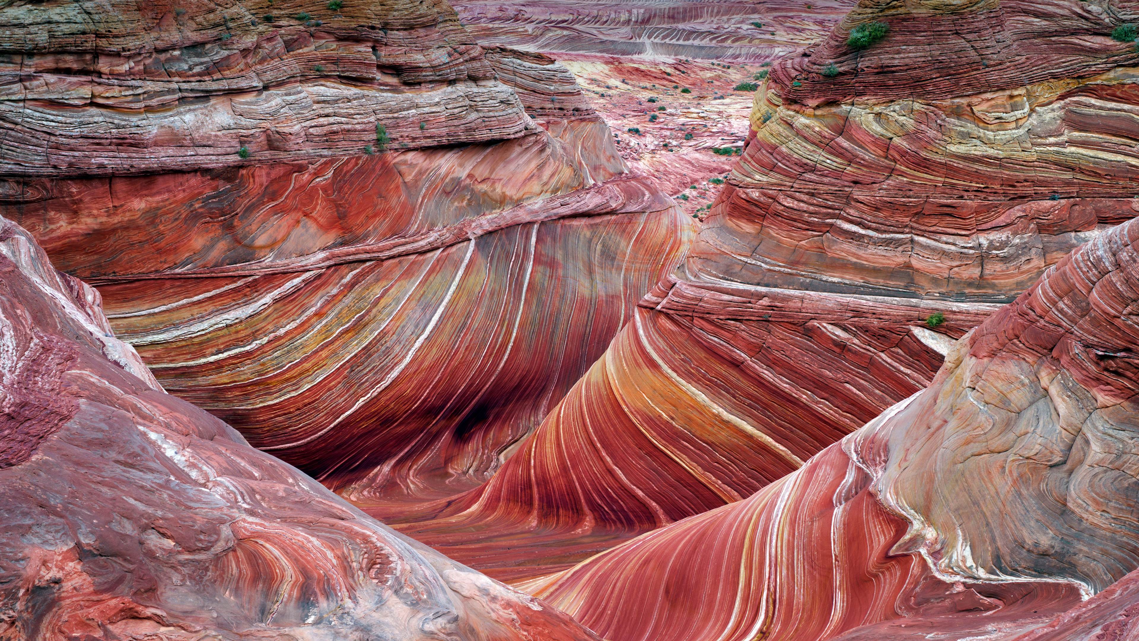 我们通过图片向你展示这梦幻场景,免去你的旅途劳顿。因为要如此近距离观察这些“波浪”——位于亚利桑那州北部荒野的螺旋状砂岩地层,你得在异常酷热的天气里,徒步走过崎岖且几乎无人踏足过的路线。你还需要办理许可证。为了保护景观,许可证数量有限,每天通过抽签发放。但也许对你来说,旅途本身和目的地一样重要?这样的话,广阔的朱红悬崖国家纪念园区的帕瑞亚峡谷中还有很多路线可供你选择,这里有着亚利桑那州和犹他州超过10万英亩的峡谷地。