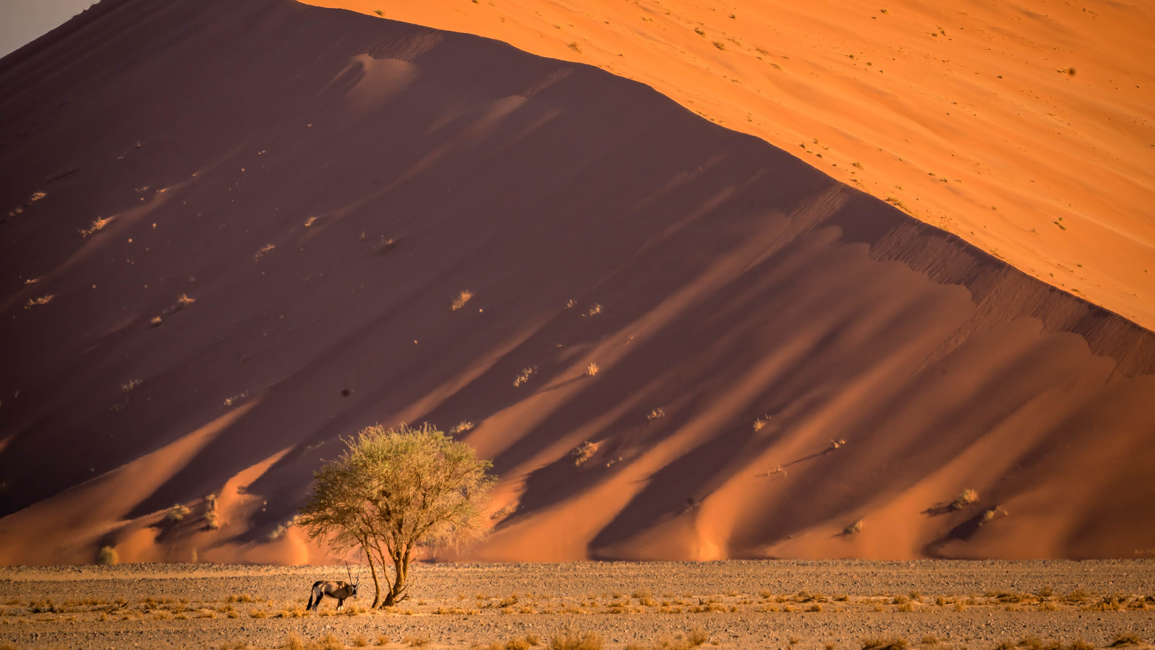 想象在日出时分,连绵起伏的沙丘泛着橙色光芒,延伸至视野尽头,欢迎来到横跨纳米比亚数千英里的纳米布沙漠。据估计它已有5500万年的历史,被认为是世界上最古老的沙漠。这里拥有地球上最著名的沙丘,包括高达1,066英尺的“大爸爸”沙丘;纳米比亚最高的沙丘“沙丘7”,高度达1256英尺;以及深受摄影师喜爱的“沙丘45”,高度约为560英尺。<br>在这片广袤干旱的沙漠中心,是苏丝斯黎,也就是今天图片中的场景。这里是一片被高耸沙丘环绕的盐沼和黏土平原,讲述了一个对比的故事。大约每十年,曹查布河泛滥时,这片平原会化作令人惊叹的碧蓝湖泊。附近的‘死亡谷’令人毛骨悚然,这里有古老干枯的骆驼刺树,由于极度干燥的气候,它们未曾腐烂,仿佛被时间冻结。游客还能在此目睹一个充满惊人生命力的生态系统。从适应力极强的剑羚到聪明的纳米布沙漠甲虫,后者通过背部收集雾滴饮用水,这片沙漠充满了生存与韧性的故事。
