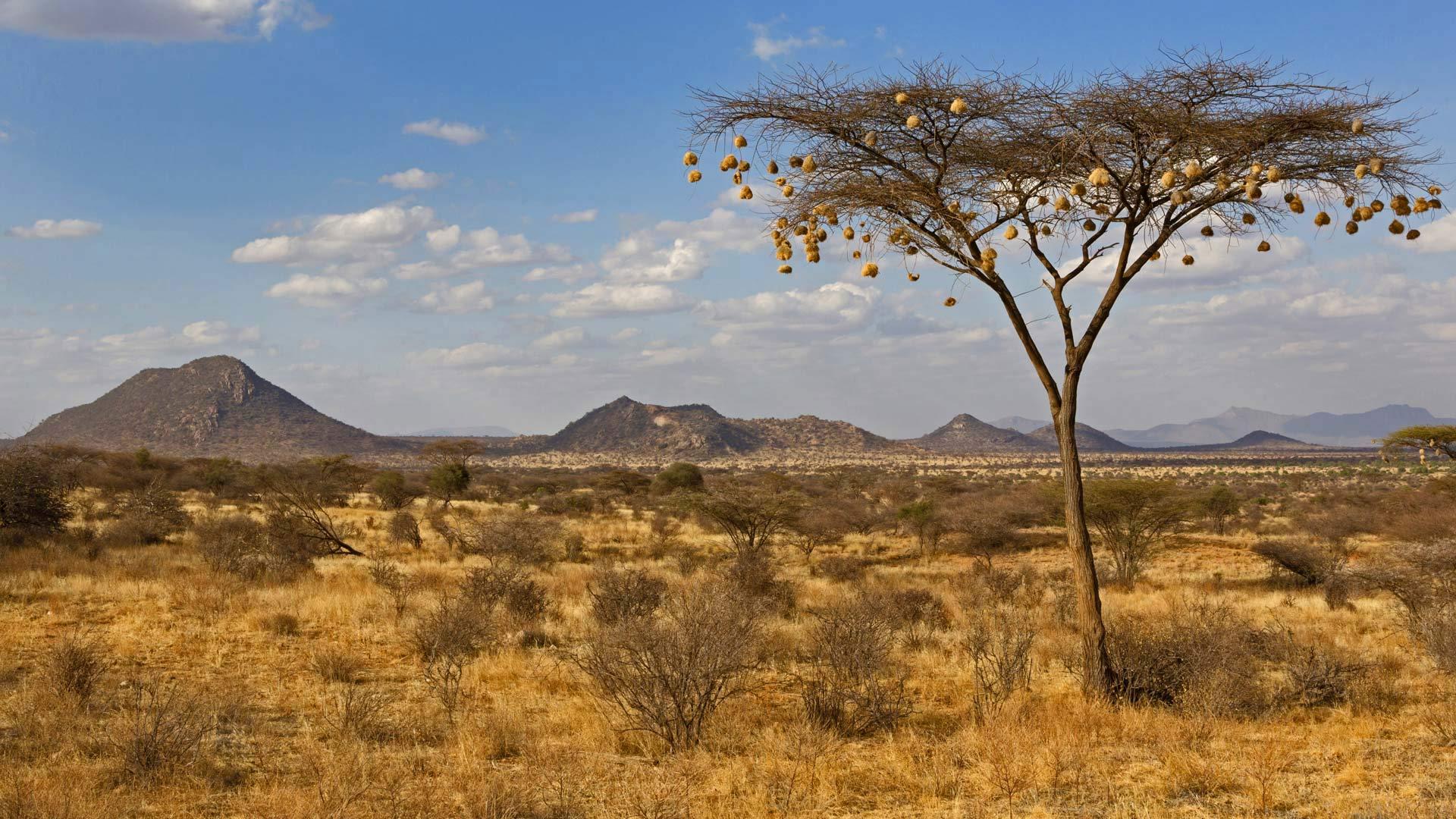 在桑布鲁国家自然保护区发现的350种鸟类中,最勤劳的是织布鸟。这种鸟类以其复杂构造的鸟巢而得名,它们用树枝、草和树叶来编织自己的家。你可以在这棵金合欢树上看到这种鸟的杰作,它们的鸟巢就像装饰品一样。一些织布鸟精心编织的鸟巢可以容纳数百只鸟,而且每一对都有各自的房间,好像在树梢上建造了一个自然的公寓。