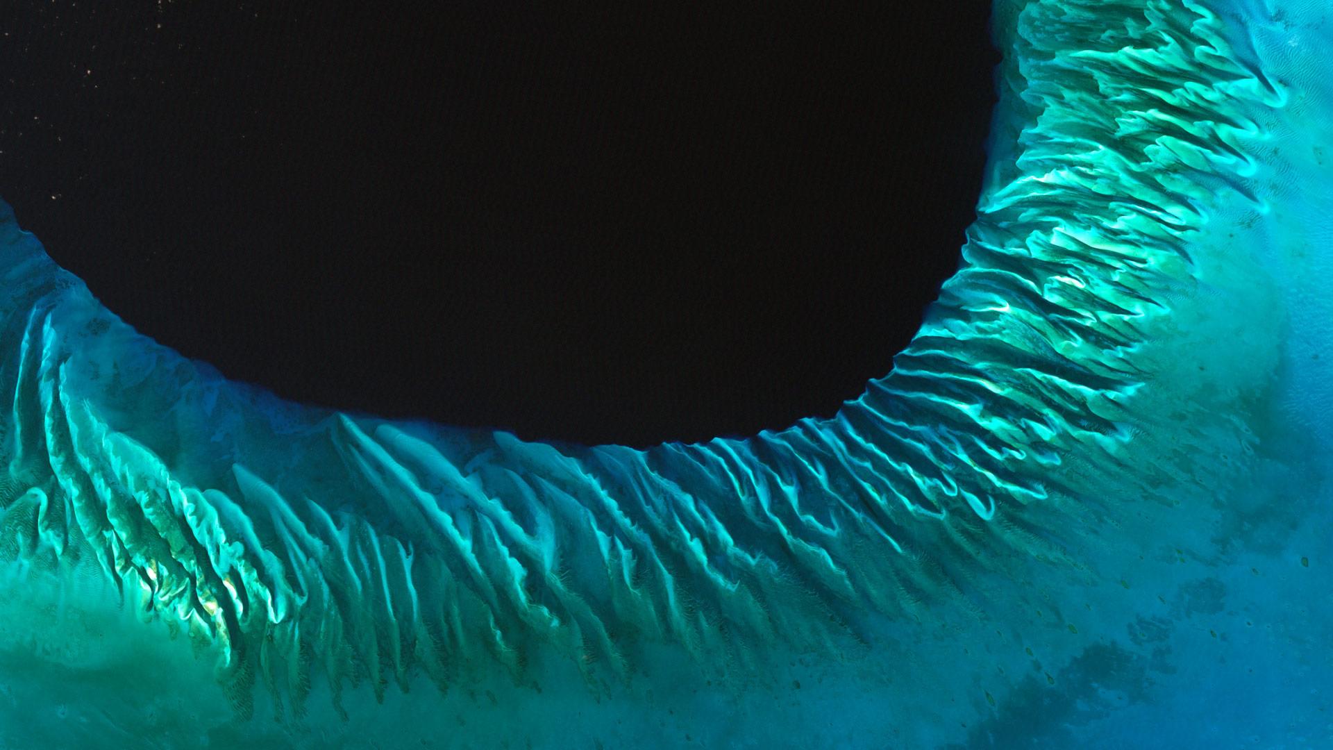 美国宇航局的陆地卫星计划让我们有机会看到这个被卫星捕获的罕见的巴哈马大西洋景观,你所看到的图案是由海洋流雕刻而成的沙滩和海藻床。看到图中那一个个暗点了吗?它被称为“海洋之舌”,其实它是一个很深的海洋暗沟,将安德罗斯岛和新普罗维登斯岛分开,并连接成一个更大的地貌——大巴哈马峡谷。