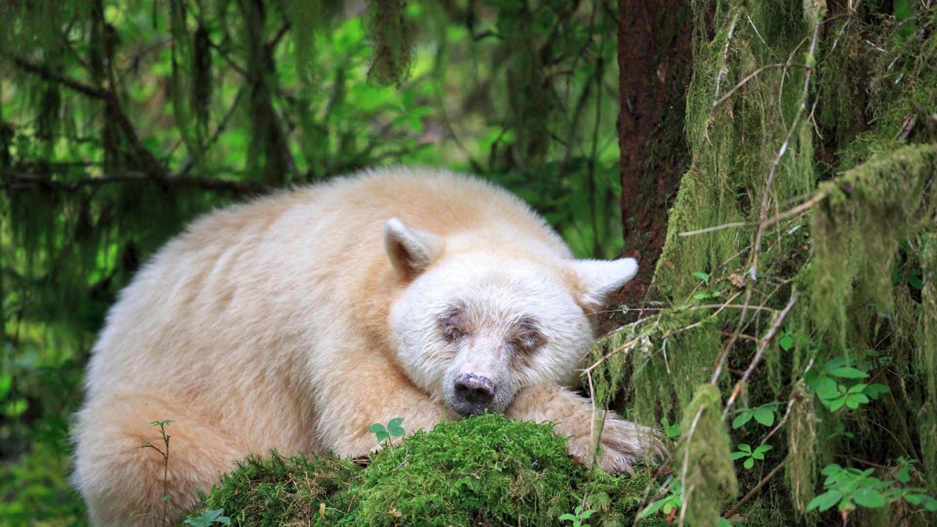 看壁纸中这只沉睡的柯莫德熊!因为谜一样的行踪人送绰号“灵熊”,它是黑熊的一个亚种,但全身的白色可不是因为白化病。一对黑色皮毛的黑熊夫妇可能会生出白色的柯莫德熊幼崽,但一对柯莫德熊夫妇却不能保证生出的幼崽一定是白色的,大自然神不神奇?“灵熊”经常出没在大熊雨林苔藓覆盖的地方——就是我们主页照片拍摄的地方,英属哥伦比亚省的沿海地区也有它们的活动记录。